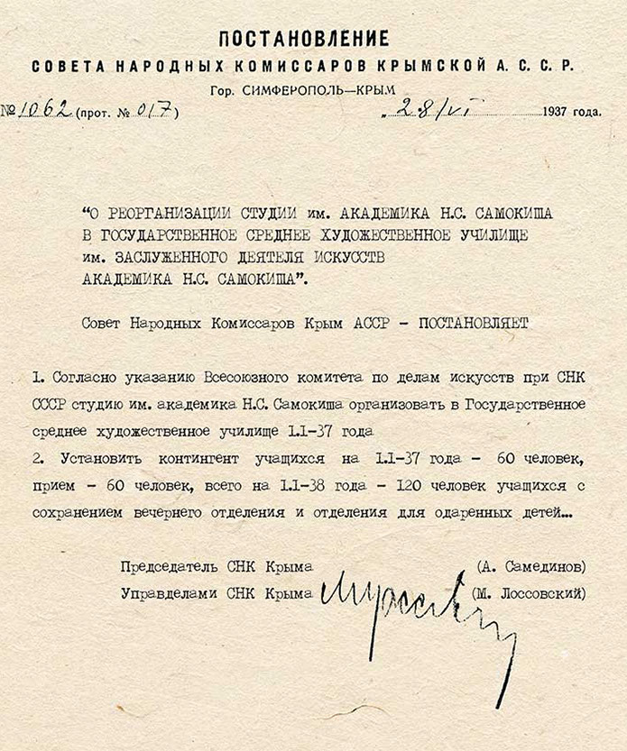 1. Постановление Совнаркома Крымской АССР № 192 от 28 июня 1937 г. «О реорганизации студии имени академика Н. С. Самокиша в Государственное среднее художественное училище имени заслуженного деятеля искусств академика Н. С. Самокиша».